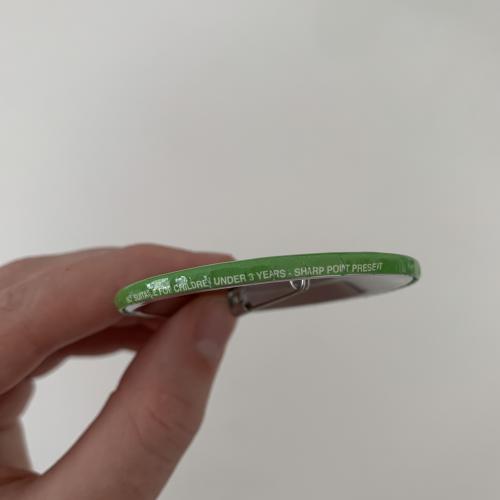 Supplied with a pin back and child safety warning as standard.