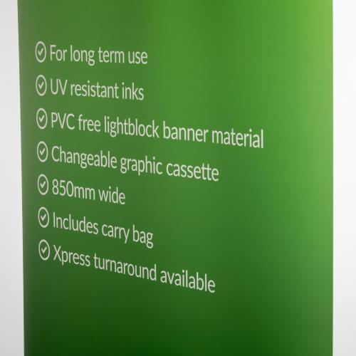 Our eco roller banner stand is a more durable, yet sustainable option for more eco conscious clients. Using our gorgeous 200 micron PVC grey back film and a unit that features a changeable cassette, you can replace the graphics in future without having to purchase a brand new stand. Ideal for frequent, more longer term use, our premium unit includes a height adjustable pole so you can vary the height of your banner. Unzip the included carry case, assemble the 3 part pole, adjust the height and pull up the banner into position. Replacement graphic cassettes can be ordered as a separate product.