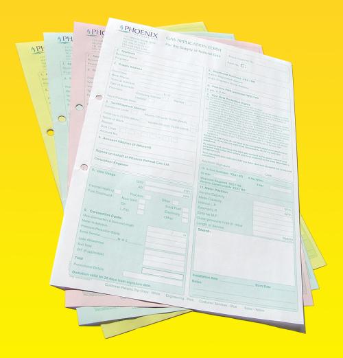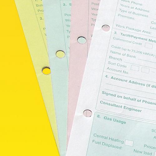 4 part NCR sets have 4 sheets glued together (it's not rocket science!) and are available in a variety of sizes and a choice of five paper colours, white, pink, blue, green or yellow. They're printed in one or two spot colours on the front and available with either a blank reverse or printed in one colour on the reverse - the perfect place to put your terms and conditions!